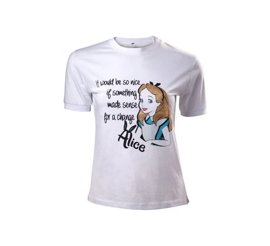 Pero lo mejor es su cuidado diseño, protagonizado por todo un clásico como es Alicia en el País de las Maravillas, y una frase de la obra de Lewis Carroll esas que quedaron en nuestra memoria: It would be nice if something made sense for a change. Fíjate bien en el dibujo de Alicia a todo color y con partes en purpurina. Es un producto oficial licenciado por Disney, con un corte moderno y tallaje diseñado especialmente para chicas, y confeccionado 100% en algodón.