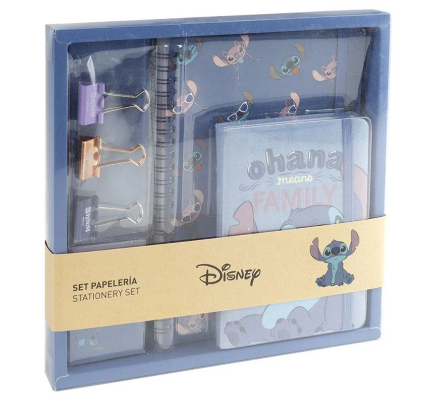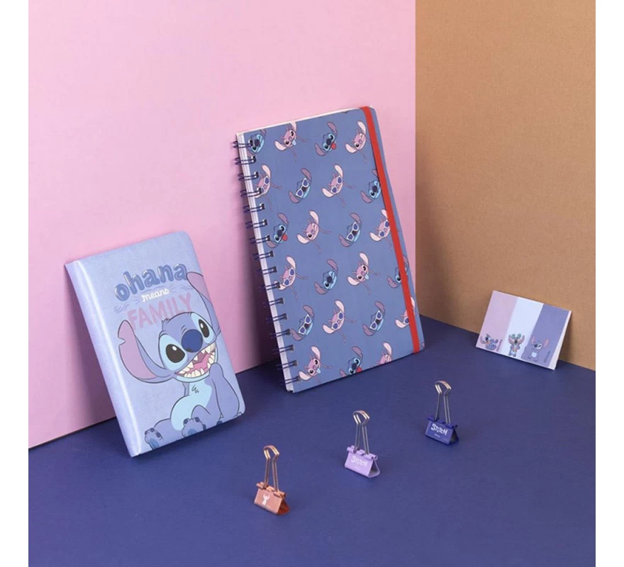 Se trata de un completo set compuesto por una libreta de tamaño A5, un bloc de notas, 3 pinzas sujeta papeles y unos Post-it. Y todo con un diseño que te encantará, en varios tonos de color azul y con los dibujos de nuestro querido Stitch, pero también de Ángel, su amorcito de color rosa.