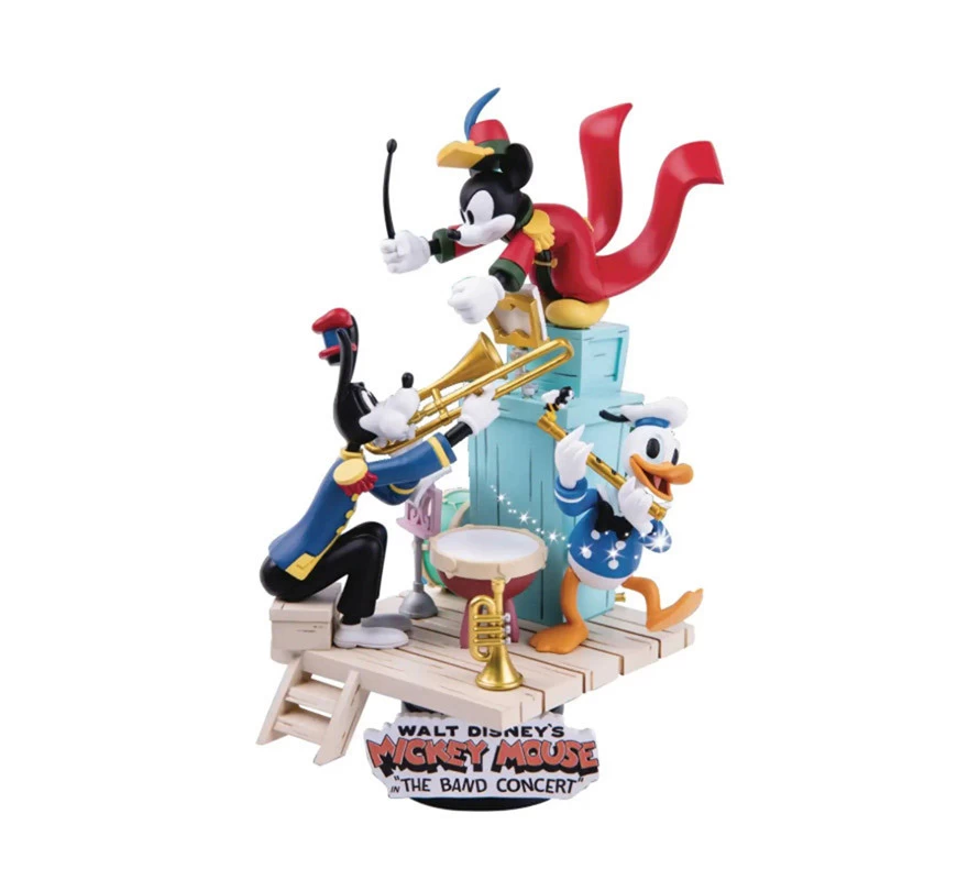 En esta ocasión, tenemos un conjunto de unos 15 cm llamado »The Band Concert», con unas figuras llenas de detalles, agrupadas en torno a un diorama, y en las que los protagonistas son nada menos que algunos de los más veteranos entre los clásicos de la animación de Disney. Y es que el diorama representa una loca banda de música en la que el Pato Donald toca la flauta, Goofy el trombón de varas y Mickey Mouse agita la batuta. .