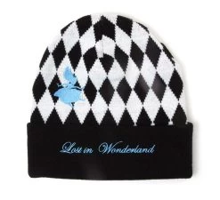 Y es que este gorro destaca por el genial estampado de rombos negros y blancos, y la silueta de Alicia bordada en hilo cuidadosamente y en ese color azul claro tan típico de su indumentaria. Además, también bordada en la parte frontal podemos leer la frase Lost in Wonderland.