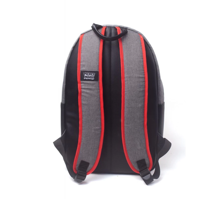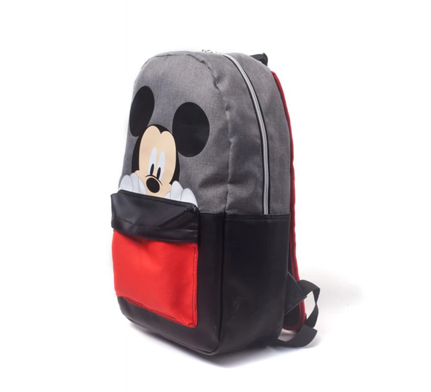 Pero sin duda lo más sorprendente es su diseño, con un divertido Mickey Mouse que parece asomarse para decir Hola y que destaca sobre el fondo gris de la parte superior de la mochila y el rojo del bolsillo frontal.