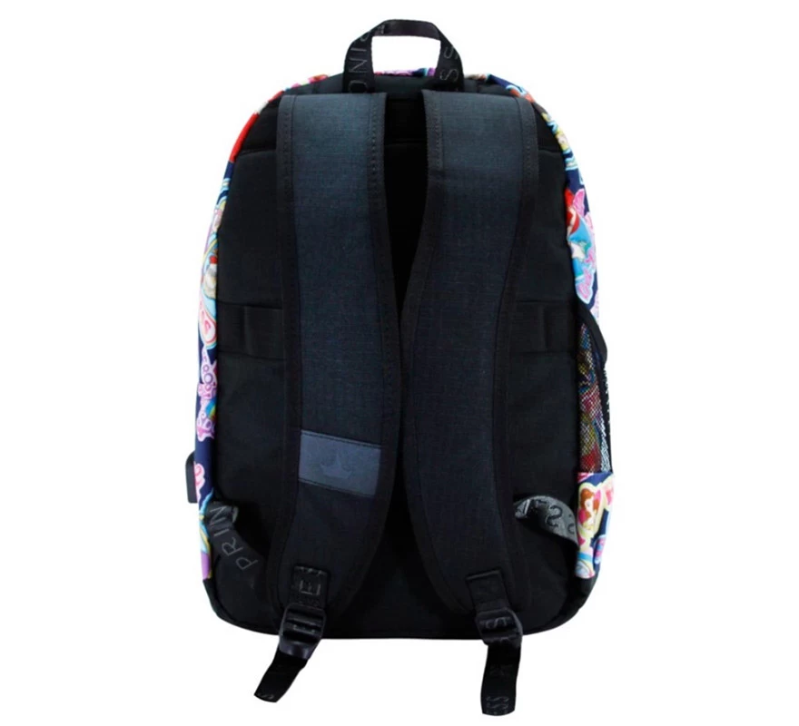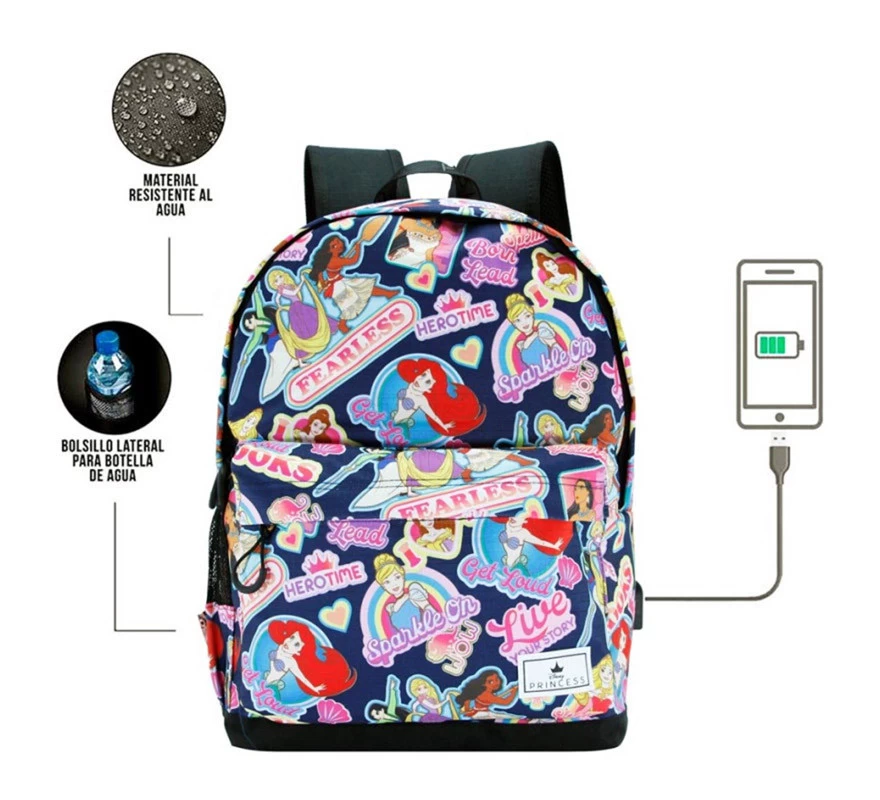 Pero sin duda lo mejor es su espectacular diseño, con un estampado o collage muy colorido y en el que aparecen personajes tan míticos como Cenicienta, Bella, Ariel de La Sirenita, Pocahontas... Es una mochila adaptable a carro, con asas ajustables y la parte de atrás acolchada. Además, cuenta en su interior con un compartimento acolchado para el portátil o la tablet y un puerto USB para cargar el móvil mediante power bank.