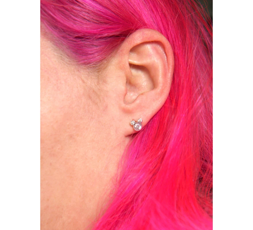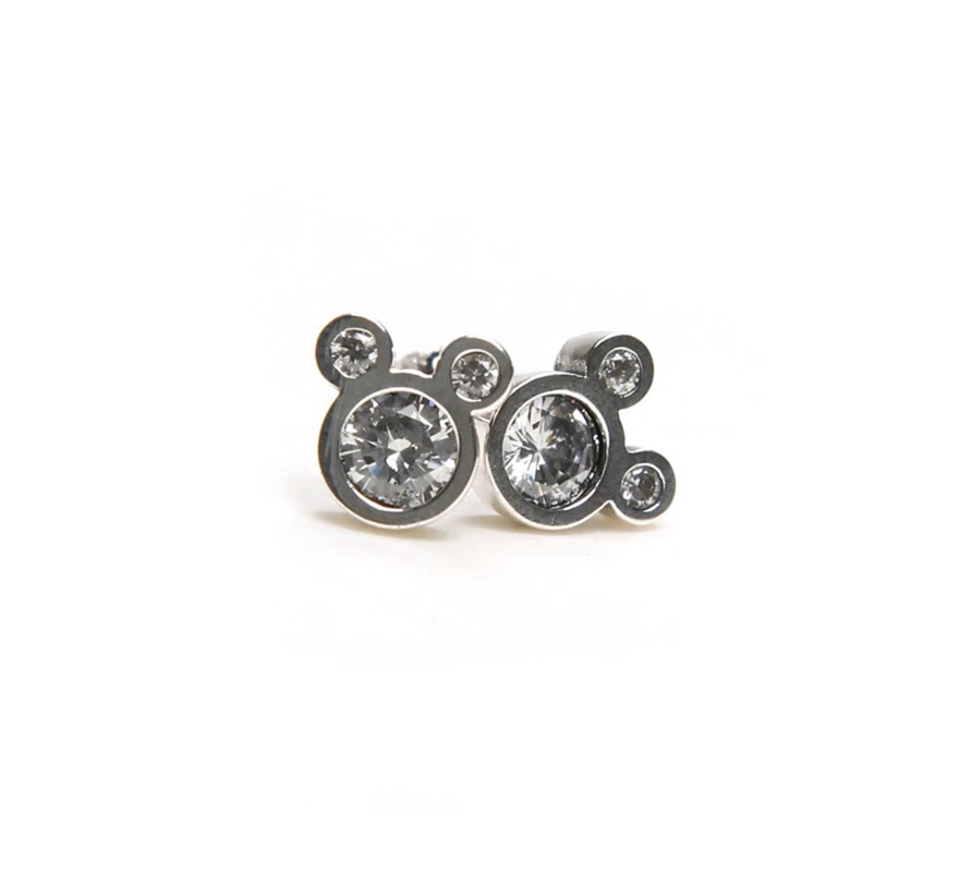 Unos pendientes muy elegantes que tienen la forma característica de la cabeza de Mickey, con esas orejitas inconfundibles que son todo un icono de Disney. Miden en torno a 10 x 10 mm y son aptos para orejas perforadas. Tanto el pendiente como la tuerca Están fabricados en Plata de Ley, y en el centro tienen circonitas brillantes, en una combinación realmente acertada.